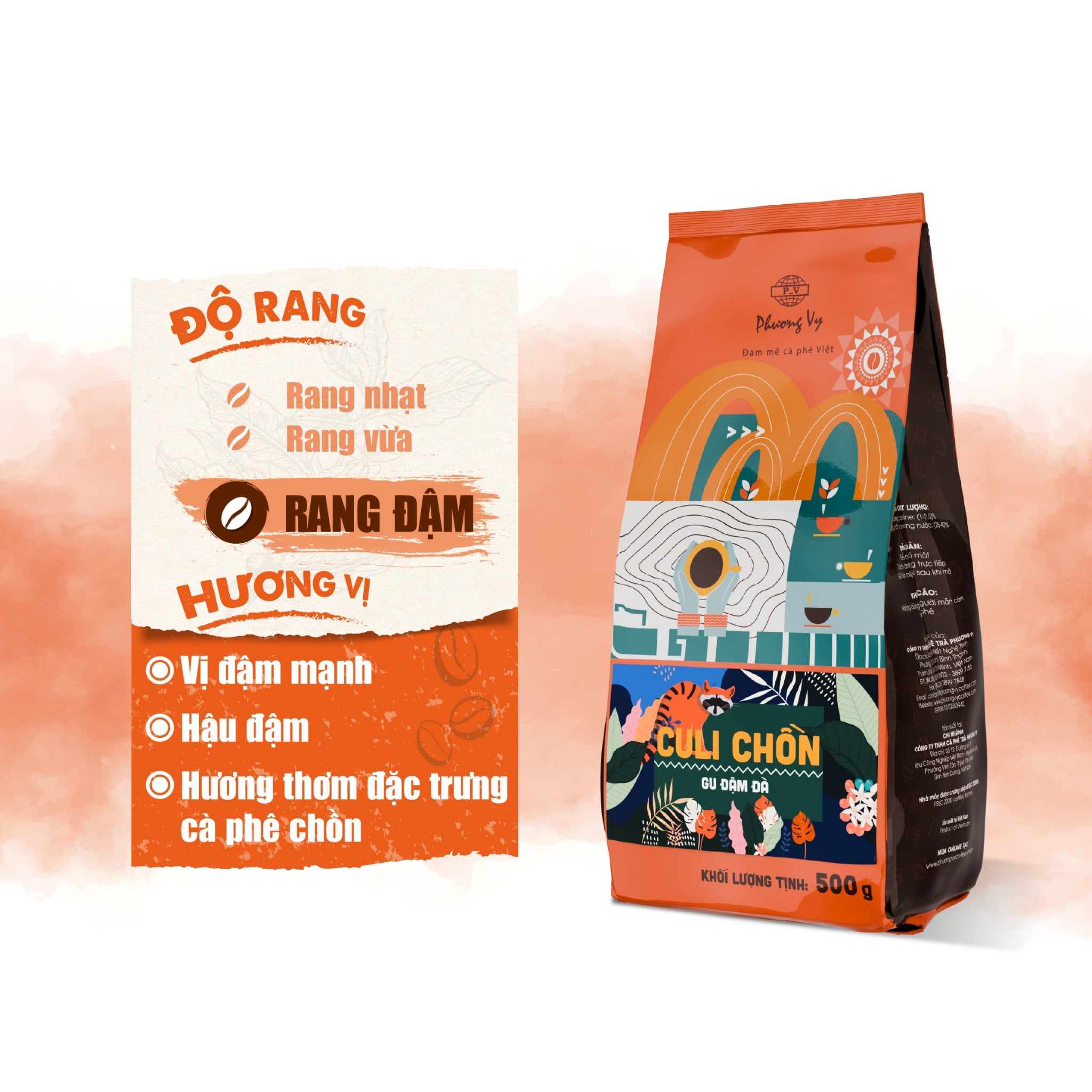 Culi Chồn được tạo nên từ những hạt Culi tròn đều, giàu caffeine và có hương vị mạnh mẽ tự nhiên. Khi kết hợp cùng phong cách chế biến mô phỏng cà phê chồn truyền thống, sản phẩm mang đến hương thơm sâu, ấm và rất đặc trưng. Mỗi ngụm đầu tiên đều tạo cảm giác đậm đà nhưng vô cùng êm dịu, không gắt, phù hợp với người thích vị mạnh nhưng tinh tế.